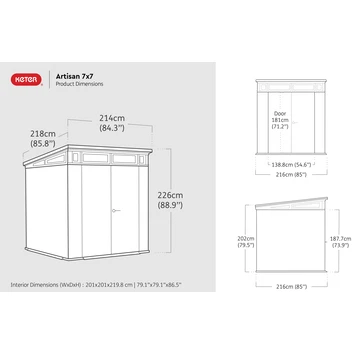 De ramen onder de dakrand en het transparante dakdeel zorgen ervoor dat er genoeg lichtinval. Met een hangslot (niet inbegrepen) is deze kunsstoffen blokhut af te sluiten. Dankzij de voorgevormde tand-groefpanelen is dit huis eenvoudig te monteren. Het tuinhuisje heeft een buitenmaat van: L 218 x B 214 x H 226 cm en een binnenmaat: L 201 x B 201 x H 219 cm. Na levering kan het Artisan 77 kunststof opbergkast direct worden opgebouwd, mits een vlakke ondergrond is voorbereid. Twee personen zijn er ongeveer 2-3 uur mee bezig om het Keter huisje op te bouwen. Kortom, met de koop van deze prachtige Keter Artisan 77 tuinhuis heb je op betaalbare wijze een onverwoestbare en praktische extra opbergruimte in je tuin