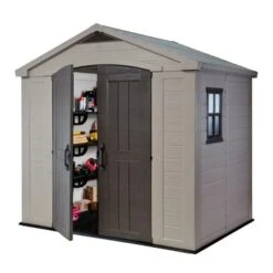 Deze Keter Factor 86 is een stevig kunststof tuinhuis doordat het is voorzien van aluminium profielen voor extra stabiliteit. De schuin aflopende vloer zorgt samen met de twee breed openslaande deuren voor een eenvoudige toegang tot het kunststof huisje. Ideaal voor het opbergen van motoren, scooters, fietsen, tuingereedschap, tuinmeubelen, kinderspeelgoed en tal van andere spullen. Na levering kan het Keter Factor 86 kunststof tuinhuisje direct worden opgebouwd, mits een vlakke ondergrond is voorbereid. Twee personen zijn er ongeveer 2-3 uur mee bezig om het Keter huisje op te bouwen. Doordat het huisje is voorzien van een bodemplaat wordt ervoor gezorgt dat je spullen schoon en droog blijven. Het raam aan de zijkant en de transparante balk in het dak zorgen voor voldoende licht in dit kunststoffen huis. Doordat het gemaakt is van kunststof kan het niet roesten, rotten of deuken.
