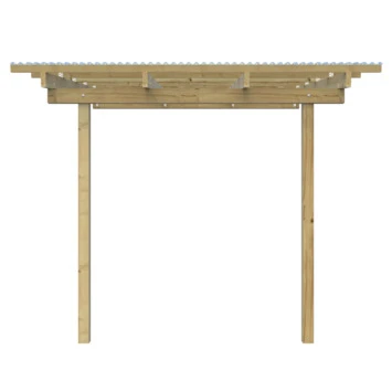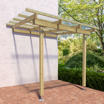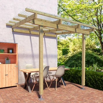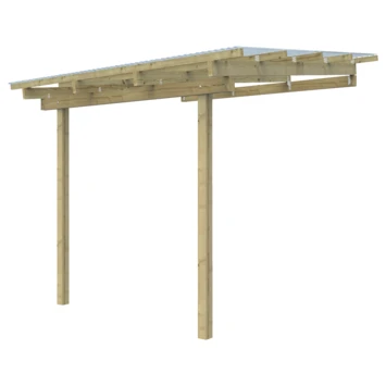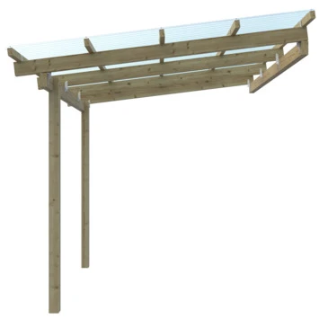 De aanbouw overkapping is 300 cm breed en 250 cm diep. De nokhoogte is 270 cm en heeft een aflopend dak. Deze overkapping kan bevestigd worden tegen een zijde van je woning of een schuurtje. Deze is ideaal voor een kleine veranda om tegen je woning te plaatsen, maar ook zeer geschikt om bijvoorbeeld fietsen en scooters onder te plaatsen. De aanbouw overkapping is gemaakt van geïmpregneerde grenen palen en balken. De overkapping heeft 2 staanders met een kopmaat van 9×9 cm een . De overkapping is inclusief transparante dakbedekking. Het is uiteraard mogelijk om zelf een andere dakbedekking erop te maken.