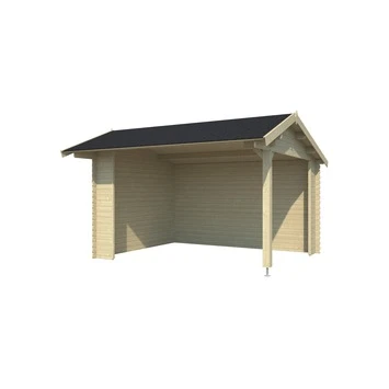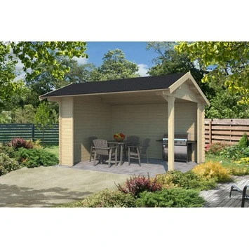 Overkapping Hawaii is gemaakt van vurenhout. De wanden, met een dikte van 2,8 centimeter, stel je samen door middel van de stapelbouwmethode. De stapelbouwmethode is een makkelijke manier van opbouwen, waarbij de planken onderling door ingezaagde profielen (tand en groef over de lengte van de plank) en uitsparingen (kruisverbanden) met elkaar verbonden worden. De planken stapel je zonder steunpilaren, laag voor laag op elkaar.