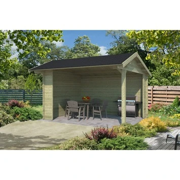 Overkapping Hawaii is gemaakt van vurenhout. De wanden, met een dikte van 2,8 centimeter, stel je samen door middel van de stapelbouwmethode. De stapelbouwmethode is een makkelijke manier van opbouwen, waarbij de planken onderling door ingezaagde profielen (tand en groef over de lengte van de plank) en uitsparingen (kruisverbanden) met elkaar verbonden worden. De planken stapel je zonder steunpilaren, laag voor laag op elkaar.