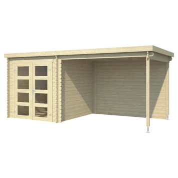 Het tuinhuis heeft een dubbele deur, voorzien van glas, zodat je overdag veel lichtinval hebt. Ook het raam aan de voorzijde zorgt voor extra licht. De deuren kun je veilig afsluiten met het bijgeleverde cilinderslot. Het platte dak helt met een heel lichte hoek met een kleine overstek voor de afwatering en wordt geleverd met een dakbedekking van asfaltvlies zodat het tuinhuis waterdicht is. Bij platte daken is het mogelijk om nog een extra laag bitumen aan de bovenkant van het dak te plaatsen om ervoor te zorgen dat het tuinhuis ook voor een langere periode beschermd is tegen water.