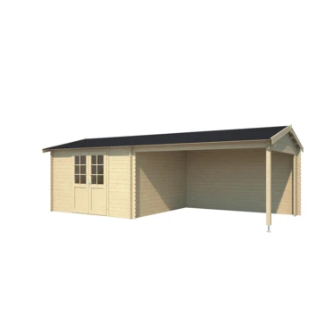Deze blokhut is voorzien van een zadeldak. Dit zadeldak geeft door de hoogte van de nok een mooie en ruimtelijke beleving onder de overkapping. De hoge deuren met lage dorpel maken het gemakkelijk om spullen, zoals bijvoorbeeld een fiets, in het tuinhuis te plaatsen. De latten voor de 6-vlaks raamverdeling op de ruit in de deur worden los meegeleverd.