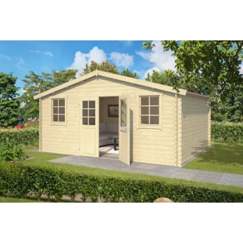 Tuinhuis Stinna is een praktische en een zeer royale blokhut met een traditionele look. Achter de afsluitbare dubbele deur met lage dorpel is bergruimte voor waardevolle spullen en/of tuingereedschap.